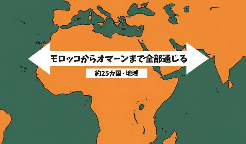 西はアフリカのモロッコ(大西洋側)から、東はドバイなどのある中東地域まで、地図上で見ると横に長〜いエリアで話されています。