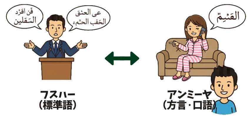 アラビア語には「フスハー(標準語)」と「アンミーヤ(方言・口語)」の2つがあります。