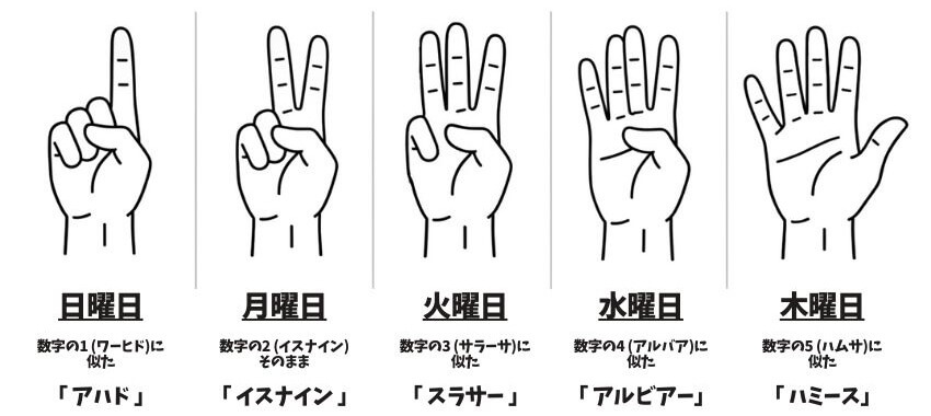 まずは「日曜日=アハド(1)」から指折り数えて練習してみてくださいね!